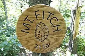 Mount Fitch is the third-highest peak[3] in the Commonwealth of Massachusetts at 3,104 feet (946 m). It is located on the ridge between Mount Greylock at 3,489 feet (1,063 m) to its south and Mount Williams at 2,951 feet (899 m) to its north. The peak sits in the northwest corner of the Town of Adams (originally known as the Town of East Hoosac[4]) in Berkshire County. The forested summit is approximately 123 yards (112 m) due west of a local high-point on the Appalachian Trail. Mount Fitch does not meet the Appalachian Mountain Club's prominence criterion of 200 vertical feet of separation from adjacent peaks as outlined in New England's Four-thousand footers list. Currently there is no side-spur trail or signage directing a hiker to the summit of Mt. Fitch from the Appalachian Trail; however, there is a wooden placard at the summit itself (pictured at right). The top is infrequently visited by hikers due to its anonymity, the bushwhack necessary to reach the top and the viewless summit.