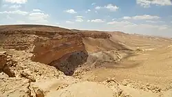 Site of Karkom winterbourne waterfall (dry state) on top of Har Karkom ridge, Israel, showing saffron-coloured rock strata
