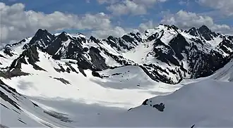 The Olympic Mountains are composed of obducted clastic wedge material and oceanic crust, primarily Eocene sandstone, turbidite, and basaltic oceanic crust.[3] The mountains were sculpted during the Pleistocene era by erosion and glaciers advancing and retreating multiple times.