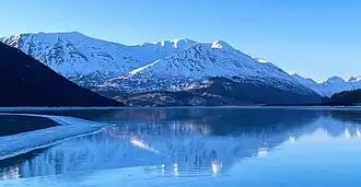 ![]() South aspect reflected in icy Kenai Lake | |