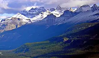 Like other mountains in Banff Park, the Murchison massif is composed of sedimentary rock laid down during the Precambrian to Jurassic periods.[6] Formed in shallow seas, this sedimentary rock was pushed east and over the top of younger rock during the Laramide orogeny.[7] The massif, which covers an area measuring five km by seven km (7400 acres), is characterized by seven rocky towers and glacial ice of the Murchison Icefield.