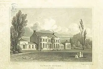 Mount Oswald then passed to the Rev Percival Spearman Wilkinson's son, Percival Spearman Wilkinson JP (1820-1898), before being acquired by the North Brancepeth Colliery Company in the 1890s.[3] The house was acquired by North of England Estates (a business owned by the McKeag family) in 1934:[6] North of England Estates operated the Mount Oswald estate as the Durham City Golf Club until 1967, when the golf club moved to Littleburn, and then operated it as a commercial golf course.[7] The property was then acquired by the property developers, Banks Group, for residential development in January 2014.[4]