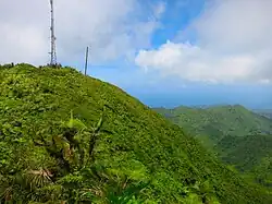 The summit of Mount Saint Catherine as seen from the Mt. Horne eastern trail approach. Visitors are enjoying the view from the radio tower platform vista.