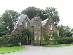 The house is built of sandstone, and part of the extension is in brick. It has a hipped Welsh slate roof. The earlier part has two storeys and the extension is partly in three storeys. The south front has a plinth, giant angle pilasters, a floor band, an eaves band, a moulded cornice, a panelled parapet with urns on the corners, and a pediment over the central bay. There are five bays, the middle bay projecting. In the centre is the former entrance, with a shouldered architrave and a cornice. The windows are sashes with keystones, the window above the entrance with a shouldered architrave and a moulded sill and apron. The west front has been extended to twelve bays, and on the east front is a Venetian window. Inside, high-quality decoration includes two screens of columns in the entrance hall, and the main staircase with finely carved balusters.[3][6]