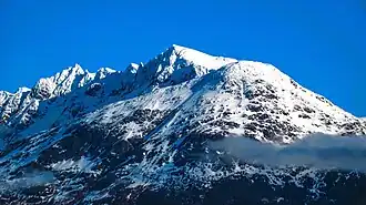 Mount Yeatman is situated eight miles (13 km) north-northwest of Skagway and 5.4 mi (9 km) west of Mount Carmack in the Boundary Ranges of the Coast Mountains.[3] Precipitation runoff from the mountain drains into tributaries of the Taiya River. Although modest in elevation, relief is significant as the summit rises 5,590 ft (1,700 m) above the Taiya Valley in two miles (3.2 km). The Klondike Gold Rush National Historical Park and Chilkoot Trail lie at the eastern base of the mountain.