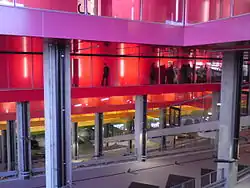 The parking garage contains parking spots for 480 cars. The space has up to 16 m high ceilings, and the underside of each level of apartments is covered in aluminum painted in a distinctive colour scheme of psychedelic hues which, as a tribute to Danish 1960s and '70s furniture designer Verner Panton, are all exact matches of the colours he used in his designs. The colours move, symbolically, from green for the earth over yellow, orange, dark orange, hot pink, purple to bright blue for the sky.[2] Besides being a sloping podium for the residential units to sit on, maximizing sunlight and views, the central garage space also serves as an atrium containing the building's circulation, affording the only access to the apartments. A set of metal stairs climb through the main space over the parking lot, providing access to the hallways across suspended industrial-looking metal-clad concrete connections, while a Swiss-manufactured, ski lift-style inclined elevator moves along the wall of the garage. Each level's hallway is enclosed and encased in painted metal both on the interior and exterior, colored according to floor in the same hues used in the main space.