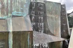 Stringer wanted the sculpture to suggest "another of Auckland's volcanoes pushing up through Aotea Square" to offer "all the delights of hills and mountains" including "waterfalls, pools and streams and the pleasant sound of falling water".[11] The triangular geometric rockiness of the sculpture's shape was intended to relate to the "canyon of buildings" encircling the square, in the tradition of the Trevi Fountain growing out of its building backdrop,[3] while also differentiating it from Auckland's existing sculptural fountains.[1] Stringer's original design included a bronze figure of a girl in modern clothes lying in a pool, representing "the spectator falling into a river and the spirit of falling water itself."[2][12] The feature was removed because it was deemed too frivolous[7] and Stringer realised after the sculpture was set out on the square that there was insufficient space to accommodate it.[6]