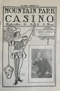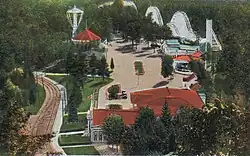 Mountain Park, located on Mount Tom in Holyoke, Massachusetts, was originally built as a trolley park by the Holyoke Street Railway Company. Trolley parks were built just outside populated areas to encourage trolley usage on weekends. The Holyoke Street Railway company created two attractions, Mountain Park toward the base of Mount Tom, and a large house on the summit of the mountain.