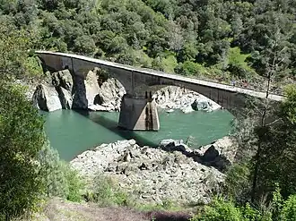 The Mountain Quarries Bridge is a railroad bridge across the North Fork American River, near Auburn, spanning between El Dorado and Placer counties. It is a concrete arch bridge that was built in 1912 to transport quarried rock.