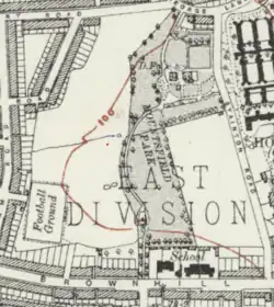 The southwestern corner of the current park was previously a football ground used by London League side Catford Southend F.C. from about 1909 until the start of World War I in 1914,[2] and then after the war[3] (the 1914 Ordnance Survey map shows the ground situated parallel to Laleham Road with its southern end just north of housing on Brownhill Road).[3]