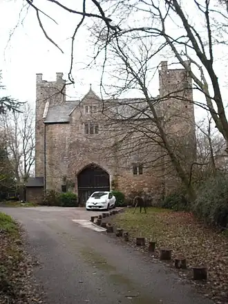From perhaps as early as the 7th century, lands at Mathern, close to the Severn Estuary, were the property of the Bishop of Llandaff. However, according to local historian E. T. Davies, a new manor of Newton-juxta-Mathern was formed out of the ecclesiastical lands, and was granted by the lord of Striguil (or Chepstow) to Sir Bogo (or Bevis) de Knovell (or Knovil), Sheriff of Shropshire and Staffordshire in 1254.[1][2] A fortified manor house or castle – sometimes called Mathern Castle[3] – was built on the site. Earthworks to the southwest of the existing buildings suggest that it was roughly square in form, with a surrounding ditch and an outer bailey.[3][4] The only built remnant from the period is part of a gatehouse to the north, dating from the 14th century. This is square in plan, with two external stair turrets and some mediaeval windows.[5]