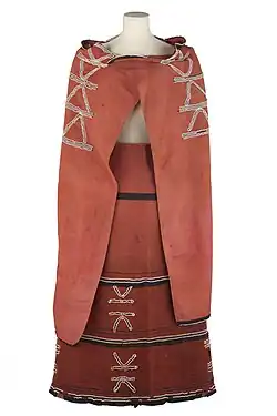 Xhosa women's outfit, made from cotton blanket fabric coloured with red ochre and decorated with glass beads, mother of pearl buttons and black felt trim