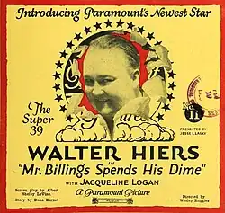 Mr. Billings Spends His Dime is a lost[1] 1923 American silent comedy film directed by Wesley Ruggles and written by Dana Burnet and Albert S. Le Vino. The film stars Walter Hiers, Jacqueline Logan, George Fawcett, Robert McKim, Patricia Palmer, and Josef Swickard. The film was released on March 19, 1923, by Paramount Pictures.[2][3][4]