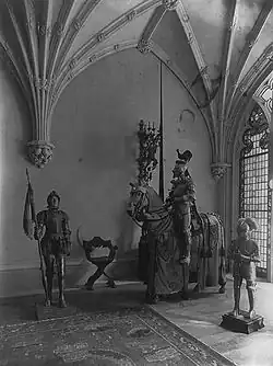 Construction was still underway when Oliver Belmont died, and Alva announced that she would build an addition that was an exact reproduction of the Gothic Room in Belcourt Castle, to house her late husband's collection of medieval and early Renaissance armor. The room, dubbed The Armory, measured 85 by 24 feet (25.9 by 7.3 m) and was the largest room in the house. She and her youngest son, Harold, moved into the house in 1909. The Armory would later be used as a lecture hall for women suffragists. She sold the townhouse in 1923.[1][2]