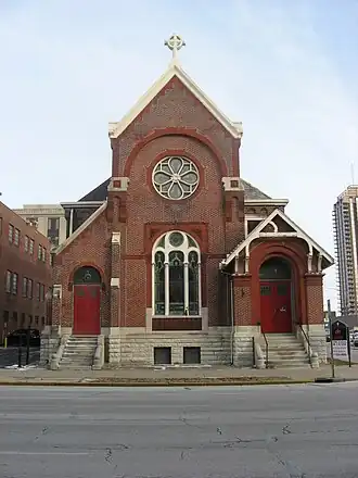 The red-brick structure was notable because it combined two styles of architecture, Late Gothic Revival and Romanesque Revival, which were popular styles for religious buildings in the late nineteenth century. The L-shaped church was built in two sections. The original chapel, which dated from 1874 to 1875, was a Late Gothic Revival-style building. The Romanesque Revival-style main sanctuary was completed in 1887 on a limestone foundation laid in 1875. The sanctuary featured round-arched windows, a rose window, and brick buttresses with limestone caps. The church was listed on the National Register of Historic Places in 1978.