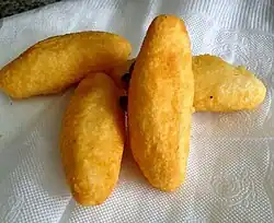 The cassava is cooked with salt for approximately 30 minutes. Once cooked, it is mashed with egg yolk and given an oval shape, a filling of cheese and chopped onion is placed inside, and it is fried in hot oil until golden brown.[2]