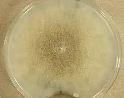 Mucor racemosus is a rapidly growing, weedy mould belonging to the division Mucoromycota.[1] It is one of the earliest fungi to be grown in pure culture and was first isolated in 1886. It has a worldwide distribution and colonizes many habitats such as vegetational products, soil and houses.[2][3] The fungus is mostly known for its ability to exhibit both filamentous and yeast-like morphologies, often referred to as dimorphism.[2] Stark differences are seen in both forms and conditions of the environment heavily affect the phases of the M. racemosus.[2] Like many fungi, it also reproduces both sexually and asexually.[2] The dimorphic capacity of this species has been proposed as an important factor in its pathogenicity and has enhanced the industrial importance. This species is considered an opportunistic pathogen, generally limited to immunocompromised individuals.[4] It has also been associated with allergy and inflammations of facial sinuses.[4] Its association with allergy has made it a common fungus used in allergen medical testing.[5][6] Industrial use of the fungus is in the production of enzymes and the manufacture of certain dairy foods.[7][8][9]