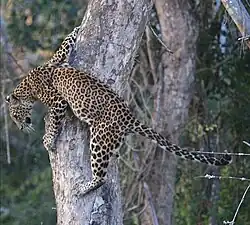 A survey carried out between November 2008 and February 2009 revealed that about 29 Indian leopards (Panthera pardus fusca) and 19 Bengal tigers (P. tigris tigris) lived in the park's core area of 107 km2 (41 sq mi).[25] As of 2018, the tiger population in the wider Mudumalai Tiger Reserve was estimated to comprise 103 resident individuals.[12] Jungle cat (Felis chaus), rusty-spotted cat (Prionailurus rubiginosus) and leopard cat (P. bengalensis) were recorded during camera trap surveys in 2010–2011 and 2018.[26][12] Two dhole (Cuon alpinus) packs were monitored during 1989–1993 and had home ranges of 83.3 and 54.2 km2 (32.2 and 20.9 sq mi); packs comprised between four and 25 individuals during this period.[27] Golden jackal (Canis aureus), and Nilgiri marten (Martes gwatkinsii) were also recorded in 2018.[12]