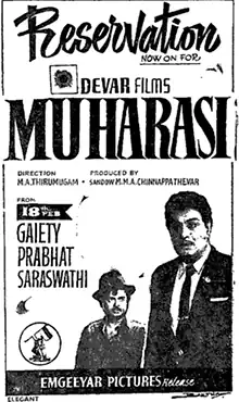 Muharasi (/muhərɑːsi/ transl. Luck of Face) is a 1966 Indian Tamil-language film, directed by M. A. Thirumugam. Based on G. Balasubramaniam's play Moondrezhuthil En Moochirukkum, itself inspired by the 1964 film The Pitiless Three, the film stars M. G. Ramachandran and Gemini Ganesan in their only film together. The film, produced by Sandow M. M. A. Chinnappa Thevar under his Thevar Films banner, was released on 18 February 1966 and ran for 100 days.[1]
