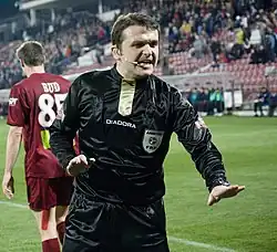 Mugurel Drăgănescu (born 10 May 1976, in Sinaia) is a Romanian former football referee. Drăgănescu was born in Sinaia, but lives in Breaza. His first Liga III match was on 28 April 2001, Metalurgistul Cugir - Minerul Moldova Nouă 1-0, his first Liga II match was 17 months later, a match between Bucovina Suceava and Rulmentul Alexandria, which ended 3-1. On 12 April 2006 Drăgănescu made his Liga I debut in a match between FC Vaslui and Argeș Pitești, ended with the score of 3-0. Drăgănescu was also a FIFA listed referee from 2009 until his retirement in 2013.[1] His basic profession is as a forestry engineer, being the director of the Câmpina Association of Hunting and Fishing Athletes. From 2014 he is also a football matches observer.[2]