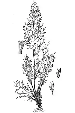 It is an annual bunchgrass growing 30 centimeters tall. The inflorescence is an open, spreading array of hair-thin branches bearing millimeter-long spikelets.