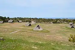 The Mukibanda site is located in the low foothills of Mount Daisen,[3] at an elevation of between 90 metres (300 ft) and 120 metres (390 ft) above sea level, and covers 170 hectares (420 acres). The settlement was naturally protected by the foothills of Mount Daisen, yet had close access to Miho Bay on the Sea of Japan, which is clearly visible from the site.[3] It is divided into several discreet areas along the hill ridge. Continuing excavations have confirmed the remains of more than 395 pit dwellings, more than 500 pillar-supported buildings, and more than 30 burial mounds. It is estimated that there are more than 1,000 buildings including unexplored areas, making it one of the largest settlements in the Yayoi period.[4]