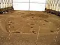 Roughly 1/20th of the Mukibanda remains have been excavated.[5] The 17.2 hectares (43 acres) of excavation revealed 395 pit-style dwellings, 502 dwellings with raised cornerstones, and 24 Yayoi-style barrow cliff tombs.[3] This area was inhabited between the late Yayoi to early Kofun period, roughly 100 BC to 300 AD.[5] The east part of the site was occupied by dwellings, and the western part of the site, on higher ground, was used for gravesites. The settlement was active in blacksmithing, bead making, and the production of earthenware Yayoi pottery. The highest point on the site in the Matsuogashira district of Daisen appears to be the home of the chief of the village and home to the sacred area of the site.[3] The entire site is thought to be the chief village, and possibly capitol, of some type of political entity.[5] The Mukibanda site is likely part of ancient Kingdom of Izumo[6] The existence of ring trenches dating from the latter half of the Yayoi period indicate that the settlement was fortified at some point, roughly corresponding to the time of the Civil War of Wa mentioned in Chinese historical sources. Remains unearthed include earthenware, stone tools (cooking tools, agricultural tools, hunting tools, weapons), ironware (agricultural tools, weapons), and broken mirrors. A total of 197 ironware items from the Yayoi period, such as hatchets, axes, chisels, drilling tools, hoe tips, sickles, and iron arrowheads, have been excavated, and some of them are of continental origin.[4]