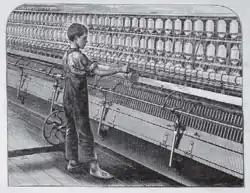 A pair of 150-foot (46 m) long self-acting mules with 1320 spindles each would be tended by three employees: the minder or operative spinner, the big piecer, and the little piecer. The little piecer would start in the mulegate on his fourteenth birthday, and rise to the status of a minder. All these men worked barefoot, wearing white light cotton trousers. There were four basic tasks: creeling, doffing, cleaning and piecing.[4] Creeling and piecing would both be done while the mule was in motion. Creeling was about replacing the bobbins in the creel while piecing the old disappearing thread with the new; it was done from behind the mule. Piecing was about joining any ends that had broken. The piecer would catch the snarled fuzzy broken end at the top of the spindle in his right hand and pull out some clean thread and wrap it around the left forefinger. This would be pressed into clean roving emerging from the attenuating rollers, pulling the hand away when the two had twisted together. All this was done while walking back and forth with the carriage, contact being made using the three of four seconds when the piecer was close enough to lean over the frame and reach the rollers. At this moment, left arm and leg forward, his crotch was adjacent to the base of the spindles.[5]