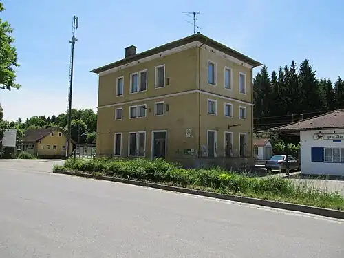 Aßling (Oberbay) station was opened on 15 October 1871 with the line. It has three tracks, but only two platform tracks as the third track serves as a passing track. The entrance building is still preserved and is located next to the main platform. The opposite side platform is connected by an underpass to the main platform. The Aßling railway disaster, which killed at least 102 people, occurred on 16 July 1945 near the station.