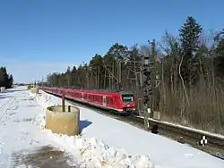 The 43 km section between Augsburg and Olching line was rebuilt to four-tracks between 1998 and 2011 to carry significantly more traffic. One pair of tracks was dedicated to regional services (RB, RE) and goods traffic and the other to (IC/EC) and high-speed traffic (ICE) services. Heavy and more slowly running freight trains no longer obstruct the passage of faster ICEs. The permitted speed on the high-speed tracks is now 230 km/h.[3] Infrastructure for regional trains allows operations at 160 km/h.[3] On the line between Olching and Munich, freight, regional trains, and the Munich S-Bahn have their own tracks.