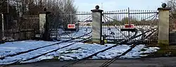 In the north-east of the repair workshop is the access gate, through which two access tracks led into the repair workshop. Directly north of the access gate is a mechanical keeper's signal box, which still serves as a barrier post for the Brunhamstraße level crossing. Until the barriers were dismantled in 2015, it controlled the level crossing on Papinstraße, which was directly in front of the gate.[31]