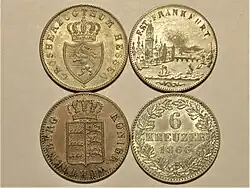 6 Kreuzer pieces from Hesse-Darmstadt, Frankfurt and Württemberg with a standard denomination side