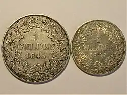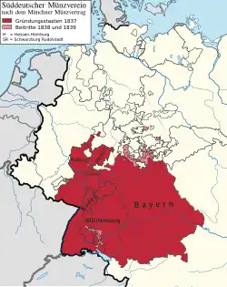 In 1838 and 1839, Saxe-Meiningen, Hohenzollern-Sigmaringen, Hohenzollern-Hechingen, Hesse-Homburg and Schwarzburg-Rudolstadt also acceded to the treaty. The South German Coinage Union lasted until the introduction of the imperial currency in 1871.[2]