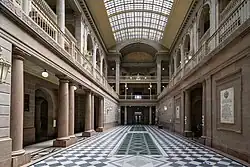The Municipal Building is located south of Hartford's downtown central business district, and is bounded on the west, south and east by Main, Arch, and Prospect Streets. It is separated from the Wadsworth Atheneum by the Burr Memorial Mall, a former roadway converted into pedestrian plaza.[2] The structure is built of brick faced with Bethel white granite, a copper and tile roof, and doors made of bronze. It has a three-story central atrium which is 25 feet (7.6 m) wide and 150 feet (46 m) long, decorated with panels depicting the history of the city of Hartford. The basement level has extensive Guastavino tile vaulting.[3]