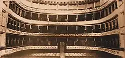The auditorium included 64 decorated boxes arranged in three levels and a gallery for the general public at the top.[1] The first box in the first row was reserved for the theatre committee.[1] Behind this box, inside an office, the archives of Nobile Teatro di San Giacomo were kept.[1]