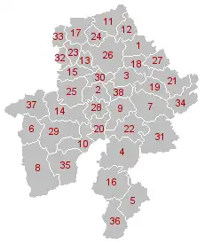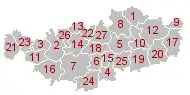 Wallonia is a region located in southern Belgium, and divided into 261 municipalities, listed in the table below. The numbers refer to the location of the municipalities on the maps of the respective provinces.