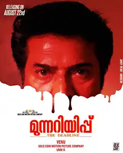 Munnariyippu (transl. Warning) is a 2014 Indian Malayalam-language psychological experimental thriller film directed by Venu[1] and produced by Ranjith, screenplay by Unni R.[2] The film stars Mammootty and Aparna Gopinath, with Nedumudi Venu, Joy Mathew, Prathap Pothan, Sreeraman, Renji Panicker, Saiju Kurup, Joshy Mathew, and Sudheesh in supporting roles.[3] Prithviraj Sukumaran appears in a cameo role.[4]