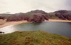 Boyeeghter Strand[1] or Boyeeghter Bay, (Irish: Bá Íochtair[2]) commonly known as The Murder Hole Beach, is a beach situated on Rosguill, a peninsula located on the north coast of County Donegal in the north-west of Ulster, the northern province in Ireland.[3] The beach lies at the north-eastern end of Rosguill, being located near Melmore Head.[3] It has cliffs, hills, dunes, and small caves. When the tide is in there are two beaches, which merge into one when the tide is out.[4] Rough Island is a small tidal island located approximately 15 metres offshore. The beach is not suitable for swimming.[5][6]