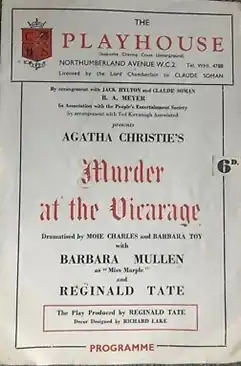 Murder at the Vicarage is a 1949 play by Moie Charles and Barbara Toy based on the 1930 novel of the same name by Agatha Christie. Christie's official biography suggests that the play was written by Christie with changes then made by Charles and Toy, presumably enough for them to claim the credit. Whatever the truth of the authorship, Christie was enthusiastic about the play and attended its rehearsals and first night.[1]