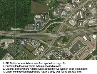 Adams arrived in East Knox County, Tennessee, between Knoxville and Strawberry Plains sometime on the evening of July 10,[2] approximately 500 miles (800 km) southwest of Washington, D.C.[4] The first reported sighting of Adams in Knoxville occurred at a BP gas station at Strawberry Plains Pike at 5:30 pm.[2][3] Gerald Sapp, an Interstate Repair Service driver, had been called to the gas station; Adams had told the clerk there that he was having difficulty with his car key and was unable to enter the vehicle.[3] When Sapp arrived, he realized that the key Adams had attempted to use was for that of a Nissan (the vehicle he had abandoned in Seattle) not the Toyota he was driving.[3] Sapp recalled: "I asked him to look in his pockets. I said, ‘If you drove this thing up here, you gotta have another key in your pockets.’ And he wouldn’t look. So I thought he was nuts. He was bound and determined that he had the key he needed for that car."[3] Sapp arranged to have the car towed to a local repair shop, and dropped Adams off at a Fairfield Inn in Knoxville on Cracker Barrel Lane.[3]