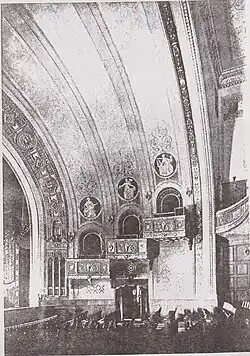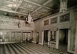 The theater had a half-barrel foyer ceiling, a carved ornamental plaster with a continuous row of Cupid heads, a lobby decorated with a sunburst chandelier, marble floors, and polished oak doors; and three painted stage curtains with pictures of Betsy Ross, Nathan Hale, and Patrick Henry.[2][3]