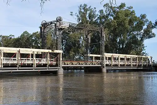 Barham bridge is timber truss, steel lift span, bridge, generally two lanes wide across the Murray River between Barham in NSW and Koondrook in Victoria. The main axis of the bridge is north—south.[1]