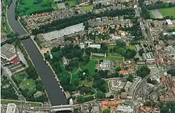 York Museum Gardens cover an area of 10 acres (4.0 ha) on the north bank of the River Ouse, just outside the city walls in the centre of York. There are four entrances to the gardens: on Marygate (off Bootham) by St Olave's Church, on Museum Street by Lendal Bridge, via a path at the side of King's Manor, and from the riverside walk next to the River Ouse. The site slopes gently down towards the river and is made up of historical buildings and undulating lawns interspersed with plants and trees. The gardens are open to the public during daylight hours, so the opening and closing times vary throughout the year. Normally admission is free but there are charges for some events.[7] In 2010 it was estimated that the gardens attract 1.3 million visitors a year.[8] Drinking alcohol, cycling and ball games are not allowed in the gardens.