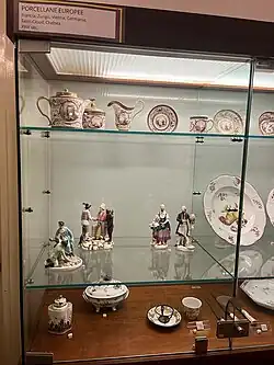 This room represents Western porcelain production, created in Meissen near Dresden, Saxony, through the efforts of Johann Friedrich Böttgerand with the support of Augustus II, Elector of Saxony. The first European porcelain factory was established in Meissen in 1710. The manufacturing method remained a secret until 1719 when it was acquired and spread across Europe.[16]