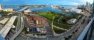 Maurice A. Ferré Park (formerly Museum Park) is a 30-acre (0.12 km2) public, urban park in downtown Miami, Florida.[1] The park opened in 1976 on the site of several slips served by the Seaboard Air Line Railroad.[2] It was originally named "Bicentennial Park" to celebrate the bicentennial of the United States in that same year. Today, the park is maintained by the Bayfront Park Management Trust. The park is bordered on the north by I-395, Metromover, and the former Miami Herald headquarters, on the south by the American Airlines Arena and Bayside Marketplace, on the west by Biscayne Boulevard and on the east by Biscayne Bay.