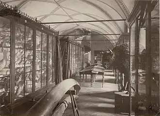 The museum opened with a much narrower focus on history and archaeology than originally planned by Tyszkiewicz.[1] The museum was given premises in the former Vilnius University (closed in 1831) – the present-day Hall of Pranciškus Smuglevičius (Franciszek Smuglewicz) of Vilnius University Library. The former assembly hall was restored taking care to clean up and renew paintings and frescoes by Smuglewicz. The museum expanded to the 2nd (former Jesuit library) and 3rd floors (former university cabinet of mineralogy) in 1856–1857.[4] The second floor was tuned into a library and an ornithological museum (basis for which were exhibits collected by Konstanty Tyzenhauz). The third floor inherited more than 10,000 minerals and related items from the former university and became a mineralogy and natural history museum.[4] Though the natural history section was large, it never became the focus of the museum.[1] The museum rapidly increased its collections. Items were donated by history enthusiasts, various societies and organizations. The museum registered 195 donors in 1858 and 323 donors in 1862.[3] The collection grew from initial 6,000 items donated by Eustachy Tyszkiewicz to over 67,000 items by 1865.[7][8]