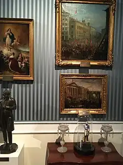 Some of the landmark items exhibited at the museum include painting works by Francisco de Goya (San Gregorio Magno), Leonardo Alenza (Satira del suicidio romántico, Sátira del suicidio por amor and El dios grande), Valeriano Domínguez Bécquer (El conspirador carlista), Antonio Carnicero (Retrato de Godoy), José Aparicio (Desembarco de Fernando VII), Joaquín Espalter (La familia Flaquer), Vicente López Portaña (Retrato del Marqués de Remisa), Antonio María Esquivel (El general Prim a caballo and Retrato de Alfredito Romea), Eugenio Lucas Velázquez (Cueva de bandidos), Charles Porion (Isabel II pasando revista a las tropas), Federico de Madrazo y Kuntz (Retrato del Duque de Rivas, Retrato de la Duquesa de Rivas, and Retrato de Julián Romea), José de Madrazo (Retrato de Fernando VII a caballo), Jenaro Pérez Villaamil (Puerta de Serranos en Valencia), Joaquín Sorolla (Retrato del Marqués de la Vega-Inclán), Manuel Cabral Bejarano (La copla), José Gutiérrez de la Vega (Retrato de Isabel II and Retrato de Larra) and Francisco de Zurbarán (San Francisco).[4]