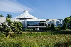 Alex Bozikovic remarks that the building closesly resembles the John Nugent Studio designed by Saskatchewan architect Clifford Wiens built six years earlier.[10] The building is considered iconic by Vancouverites and is one of the most immediately recognisable buildings in Vancouver.[11] It was nicknamed 'the Taj Mahal on the creek' when first built and is characterised by its sweeping conical shape and reflecting pools crossed by curved pedestrian bridges.[12]