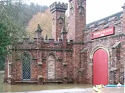 Around 1840 a warehouse was constructed here for the Coalbrookdale Company, to plans by the architect Samuel Cookson.[2] Its architectural style is highly distinctive and most unusual for a warehouse. It follows the Gothic Revival architecture recently made fashionable by Pugin and already made use of locally for St Luke's Church, Ironbridge. St Luke's is in the simple Commissioners' Gothic style, by local architect Samuel Smith of Madeley. That style is close to the original medieval Gothic and follows Pugin's ideas. The style of the warehouse owes far more to Horace Walpole's Strawberry Hill than to Pugin. The parapet of the roof is crenellated at each end and decorated with pinnacles. The Eastward, riverward face is extended with a church-like apse, flanked by two narrow towers decorated with cross-shaped arrow loops, but actually hiding chimneys.[3] Construction is of local red brick, with yellow brick dressing. The main roof is simple and warehouse-like, comprising four tiled bays with simple gable ends. Most of the walls are blind, with only high windows in the gables for security and the walls between supported by buttresses. The apse extension, originally an office, has tall lancet windows to give light, and reinforcing the church-like atmosphere of that facade.