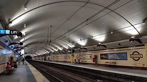 Designed by John Bradfield in the Inter-War Stripped Classical architectural style,[1] the station comprises two platforms, each 158.5 metres (520 ft) long by 3.8 metres (12 ft) wide, under an arch with span 14.6 metres (48 ft). Museum's signage and cream tiling with maroon highlights are reminiscent of a typical London Underground tube station of the era, however its layout of central tracks under a grand arch are more in keeping with older stations of the Paris Métro. Until the construction of the Airport Line in the 1990s, it was the only underground station in Sydney without an island platform. It is a companion to St James station, both opened at the same time and use a roundel design on their station signage that is similar to the one used on the London Underground. The station opened on 20 December 1926 with the opening of the eastern city line from Central to St James.[1][10][11] It became part of the City Circle loop on 22 January 1956.
